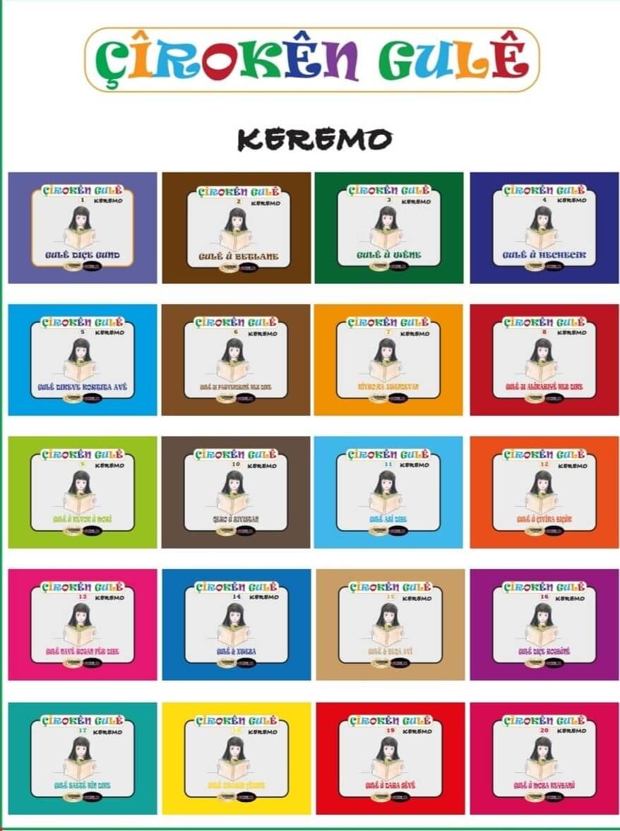 | Pîvan | Çîrokên Gulê - 20 pirtûk-Keremo Set bi tevahî ji 20 pirtûk, kartpostalek ku wêneyê 28 Navdarên kurd li serê ye û qutiya xwe ya taybet pêk tê. Pirtûk bi du zaravayên Kurdî, bi Kurmancî û Zazakî, ango Kirdmanckî hatine amade kirin. Ji kaxizên |