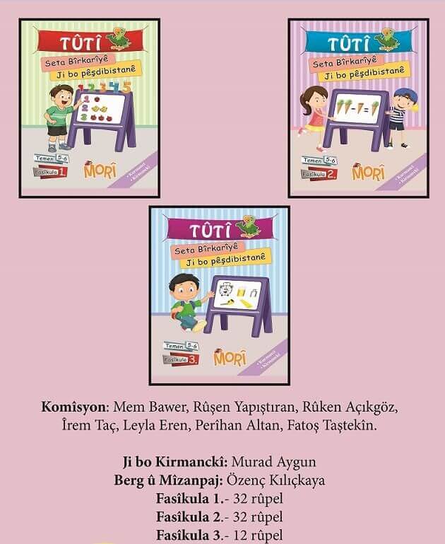 | Pîvan | TÛTÎ (SETA BÎRKARÎYÊ )- Ji bo pêşdibistanê Set ji 3 fasîkulan pêk tê. Di fasîkula yekem de hejmar heta 5an bi saya çalakîyan, danasîna wan hatîye kirin. Her wekî din bi reng û teşeyan jî zarok dikarin bi hêsanî hejmaran hîn bibin. Fasîkula |